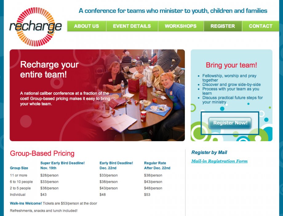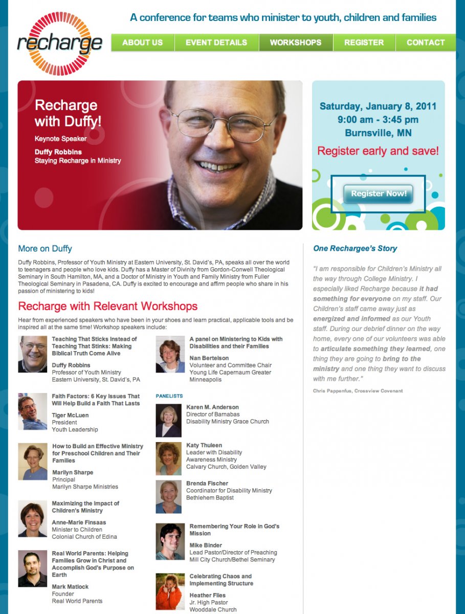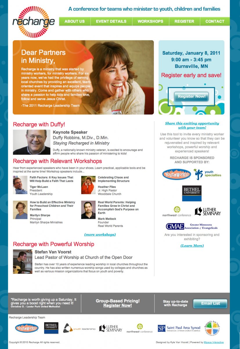 For the Recharge site Mipaca Interactive was again chosen along with designer Kyle van Voorst to update the site for the 2011 conference. The Recharge conference is for teams who minister to youth, children and families. The site includes integration with MailChimp for visitors to subscribe to newsletters and updates sent out by the Recharge team.
