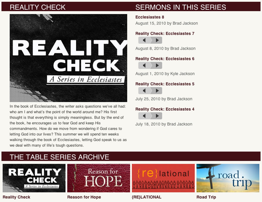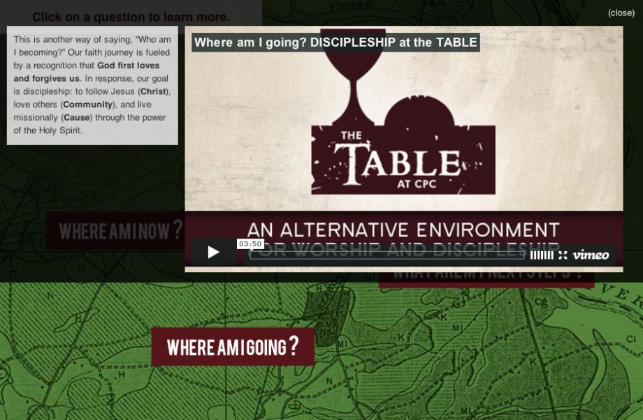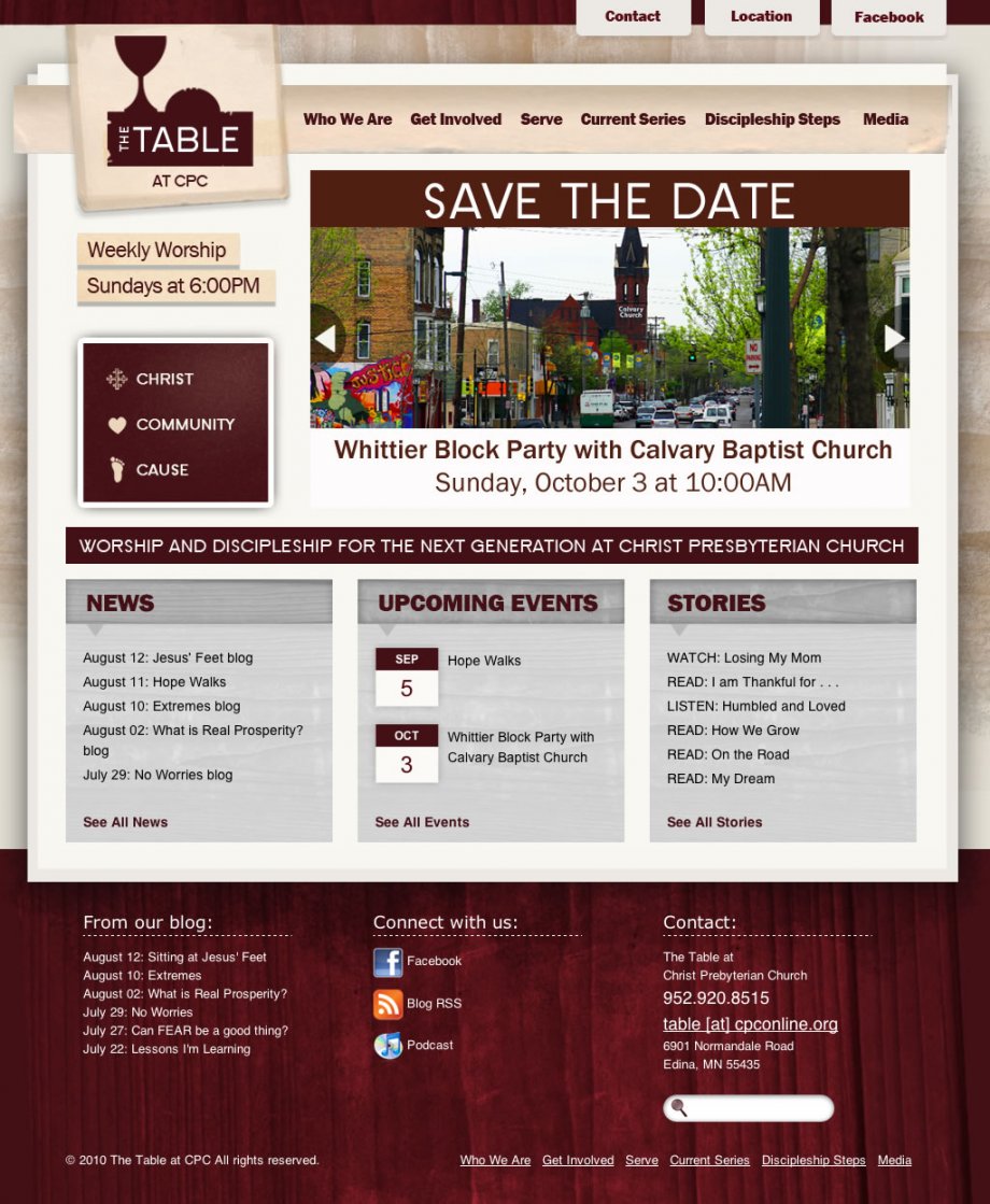 Working with the staff of Chirst Presbyterian Church (CPC), Mipaca Interactive developed a Drupal based site for their Sunday night service The Table at CPC. The site has many features including audio and video players, RSS feeds for a Blog and Podcast and a customized discipleship map that makes great use of jQuery.